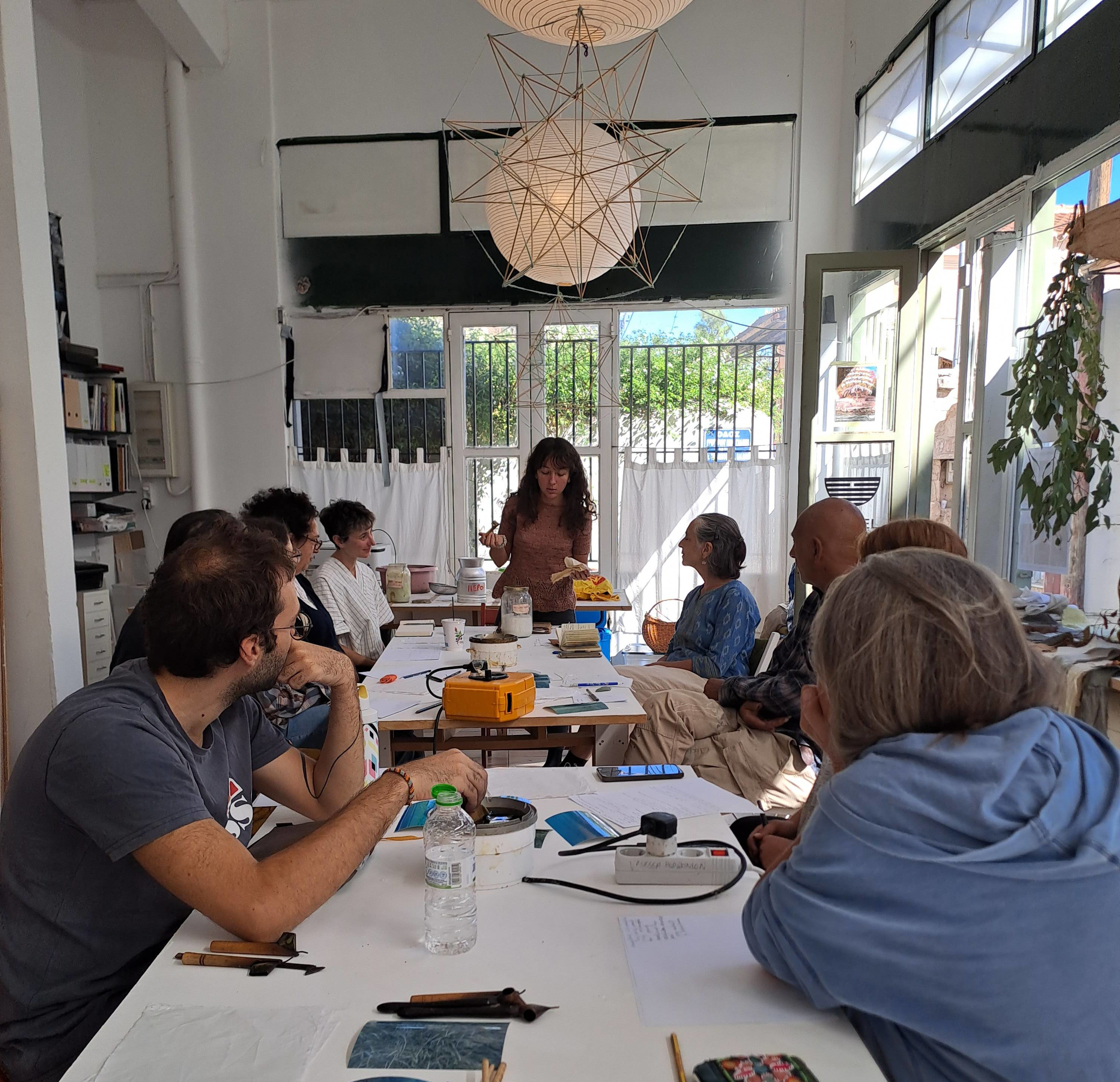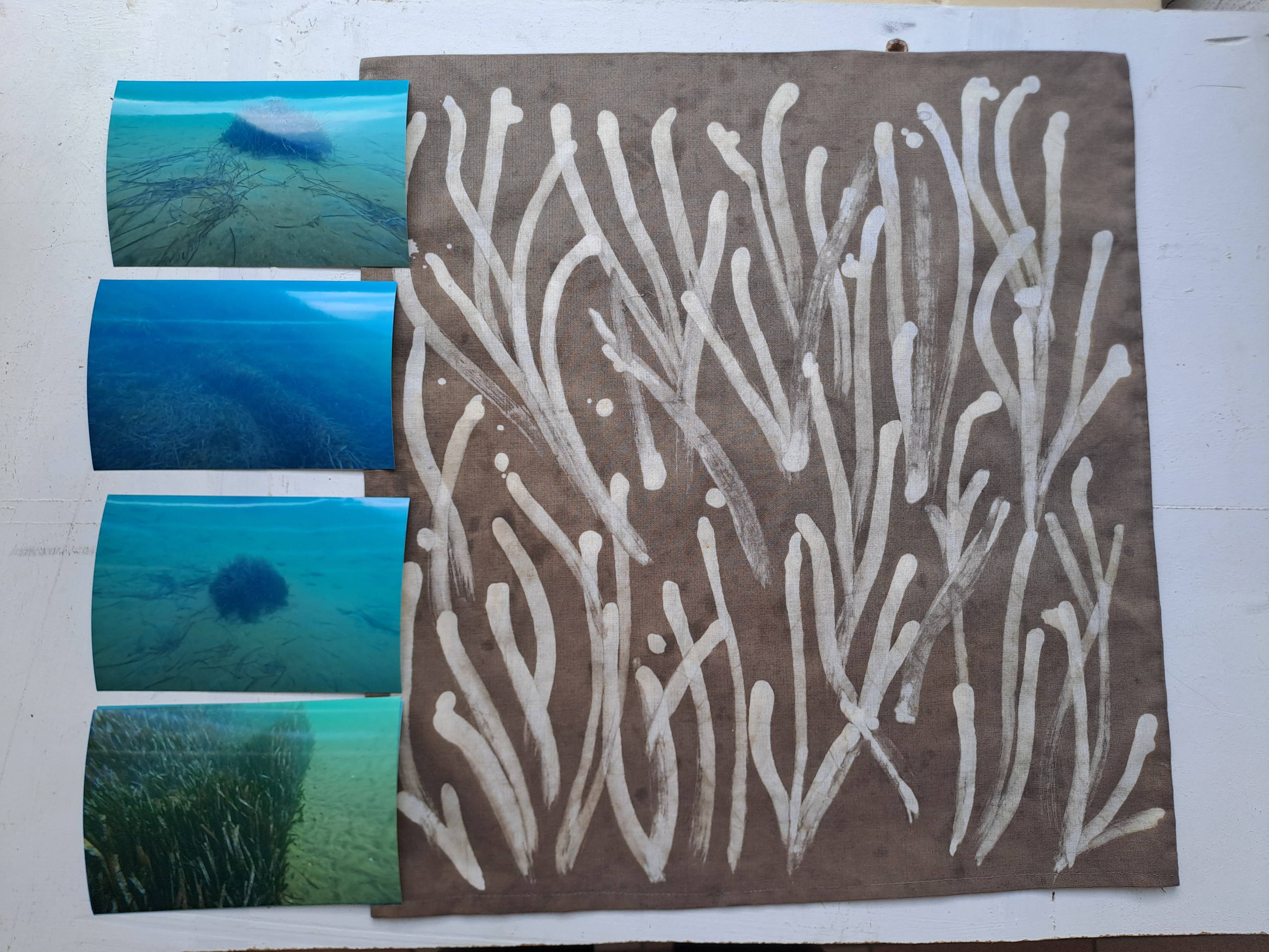 Σε αυτό το εργαστήριο, η πρόθεση ήταν να δημιουργηθεί ένας άμεσος σύνδεσμος ανάμεσα στη γη και τη θάλασσα, χρησιμοποιώντας βαφές που φτιάξαμε για να αποτυπώσουμε εικόνες των φυκιών κάτω από την επιφάνεια, δημιουργώντας νέους τρόπους σκέψης γύρω από την ορατότητα, τη συνείδηση και τον σεβασμό προς τη βιοπεριοχή μας.