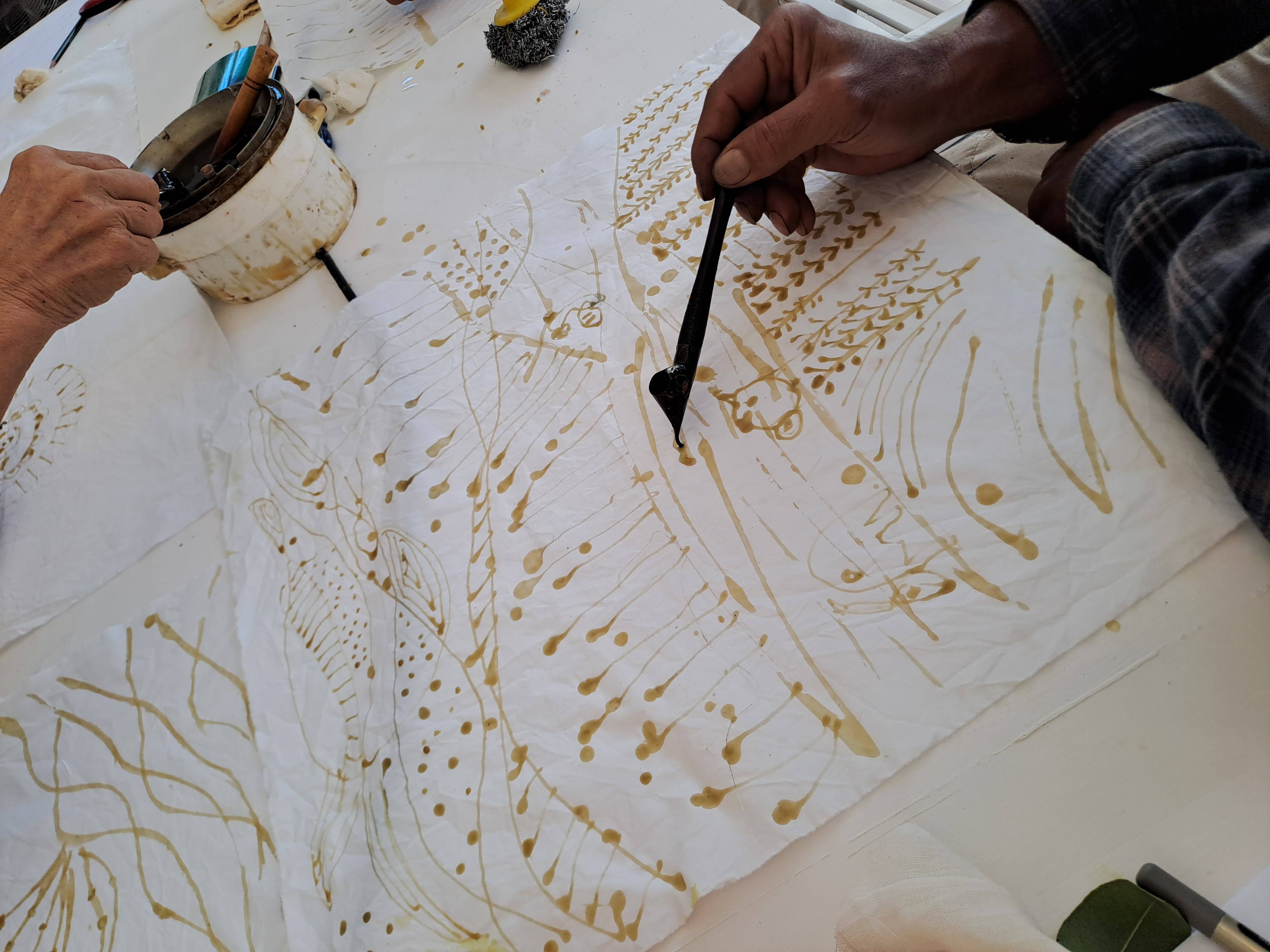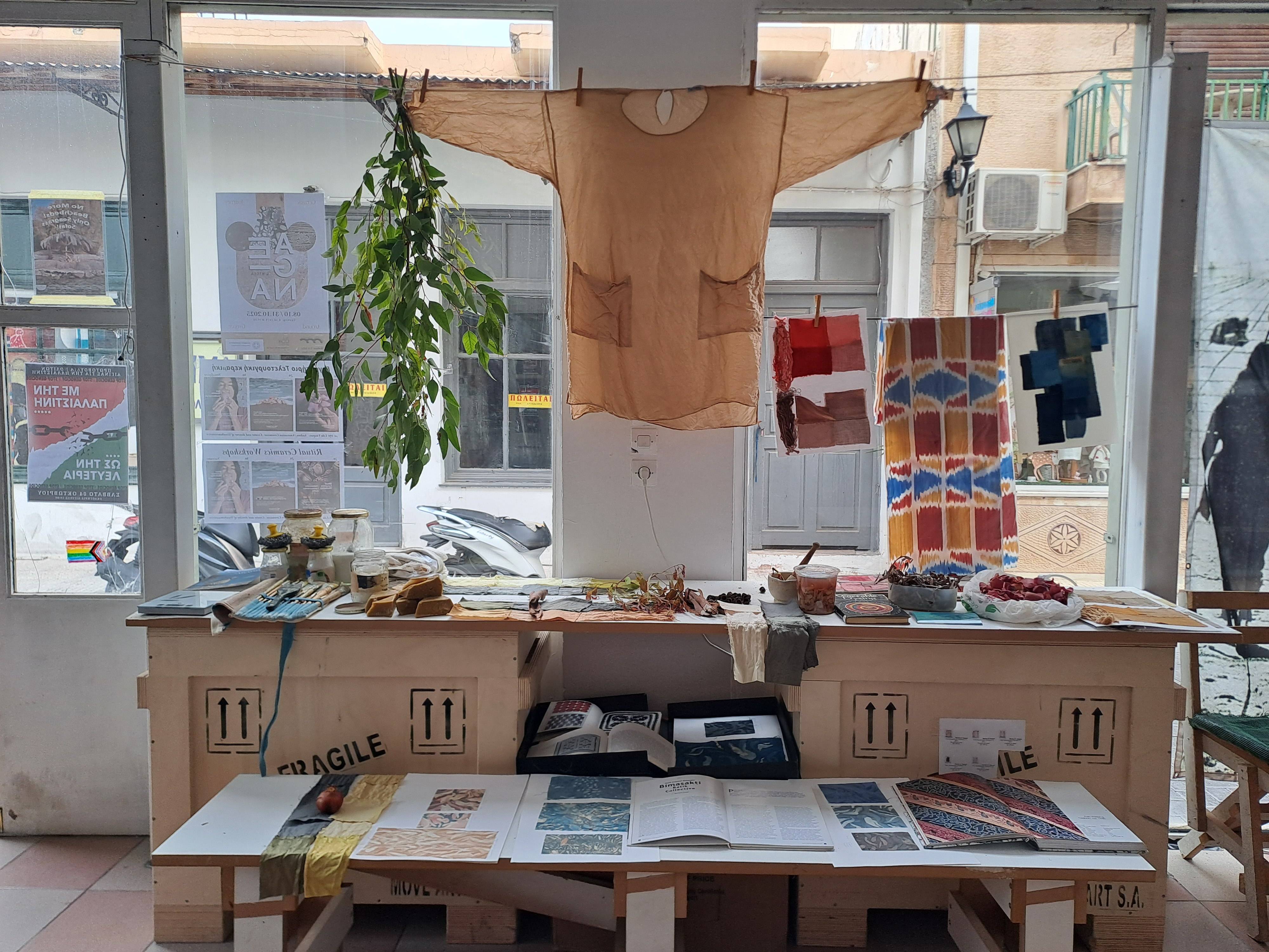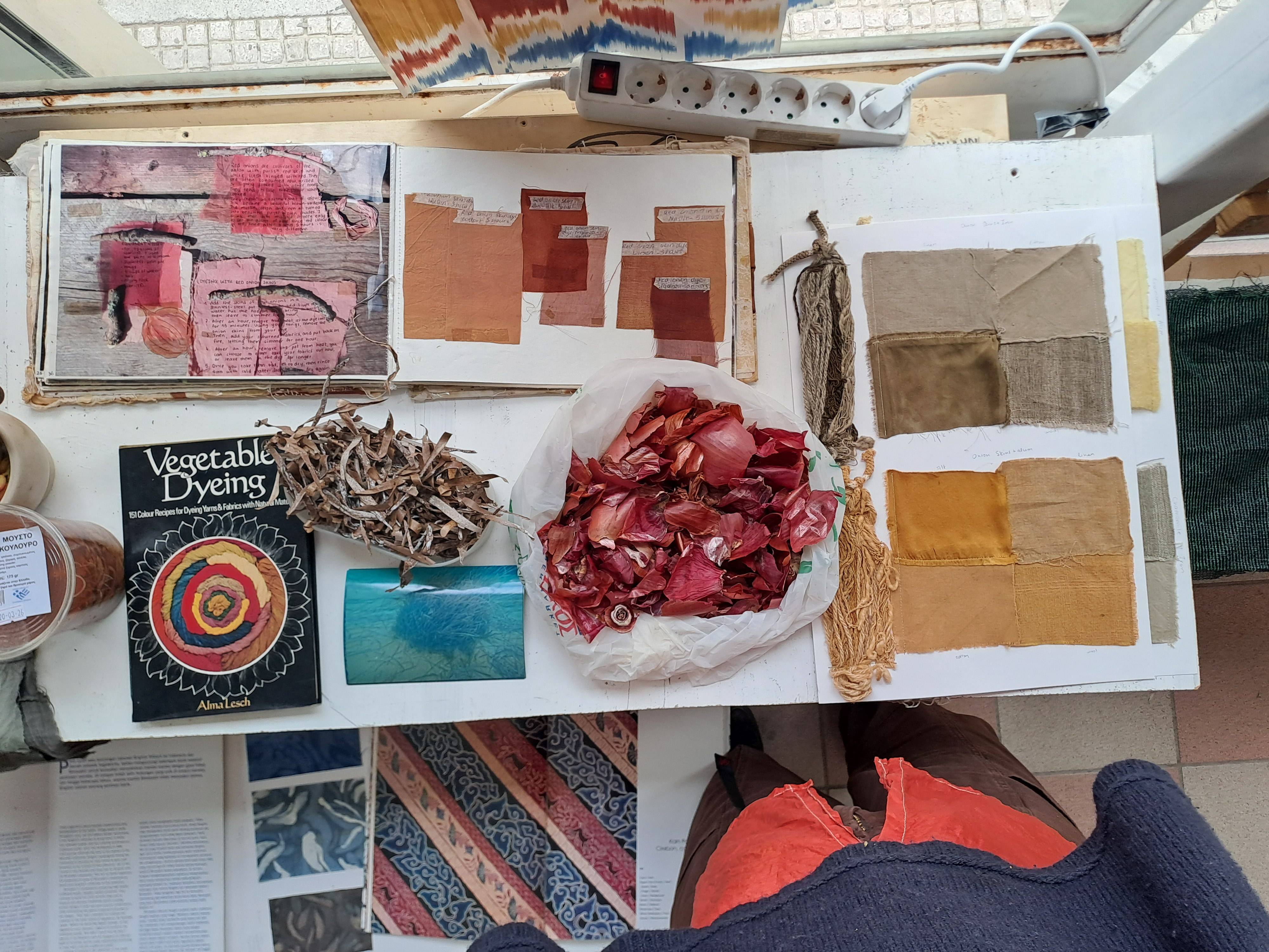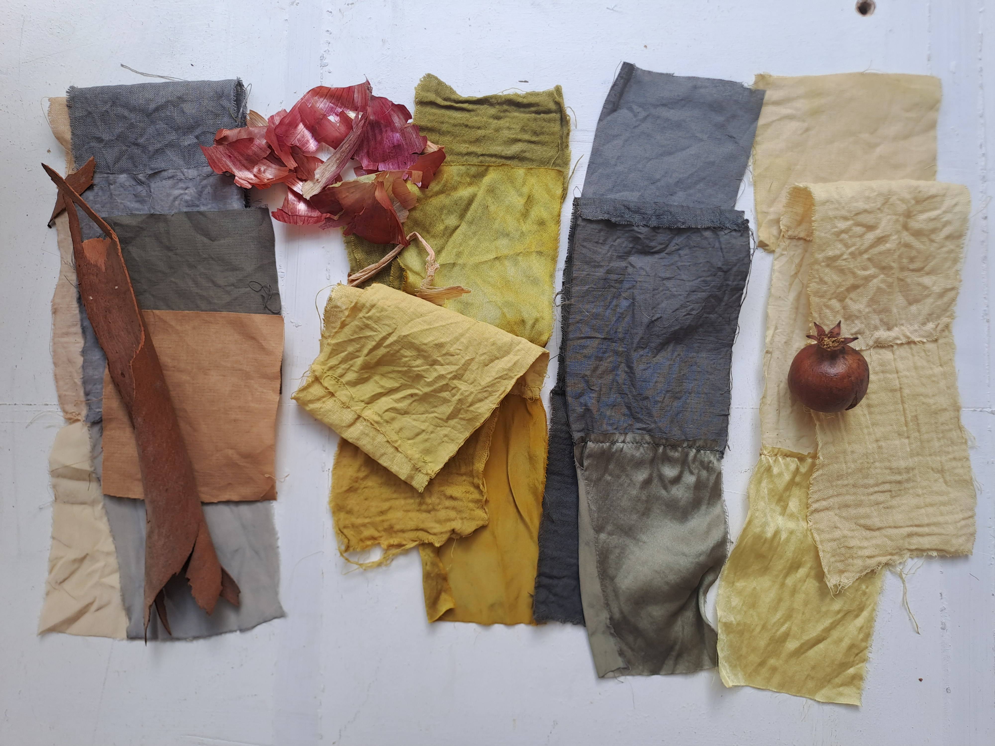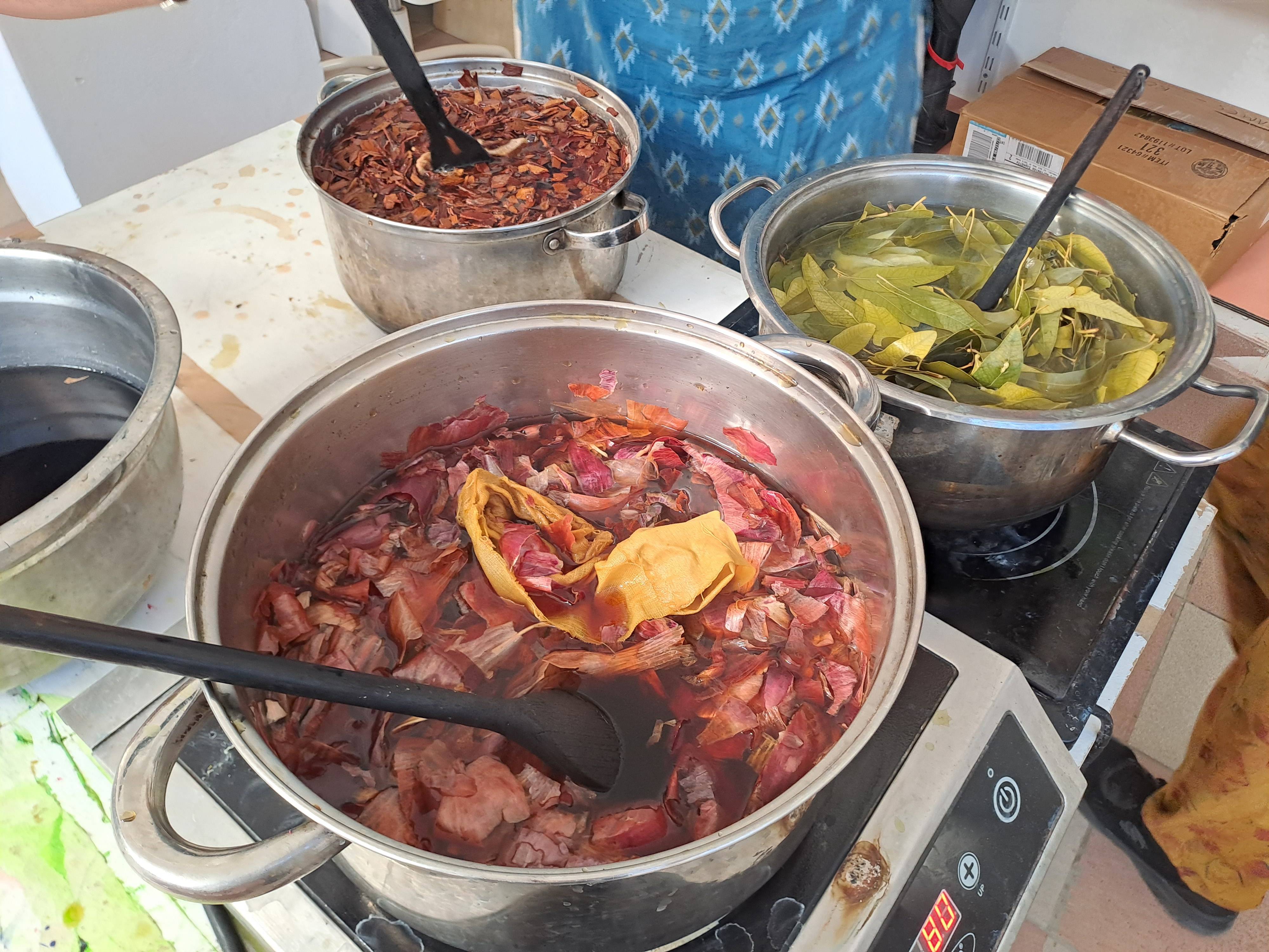 Σε συνεργασία με την Χριστιάνα Βαρδάκου (https://www.christianavardakou.com/) εξερευνήσαμε τις φυσικές χρωστικές που είναι διαθέσιμες στο νησί, συμπεριλαμβανομένων φλούδων φιστικιών και κρεμμυδιών, φύλλων και φλοιού δέντρων ευκαλύπτου, κελυφών ροδιού και βελανιδιών. Μάθαμε πώς να εξάγουμε χρωστική από αυτά τα φυτά και να την χρησιμοποιούμε αυτούσια ή σε συνδιασμό με σίδηρο για να δημιουργήσουμε μια πλούσια τοπική παλέτα.