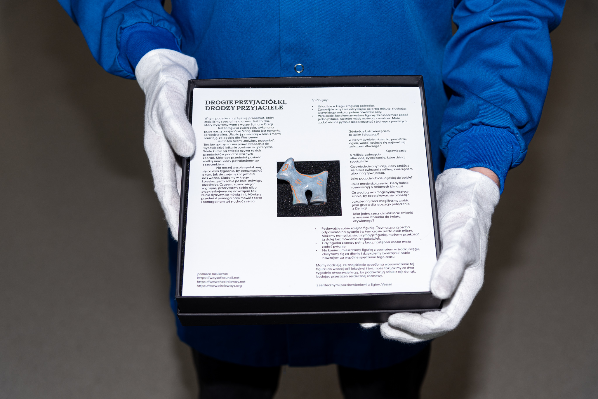 The Greek art group Vessel has written the rules for the Council—a gathering where you can share your ideas, dreams, and fears. The ceramic animal you’ll find inside the box was made by Maria Sánchez Alonso, a Spanish dancer and poet who lives on the Greek island of Aegina with her three cats. The person holding the object has the right to speak—they cannot be interrupted until they have finished speaking. That’s why the ceramic animal is called a “talking piece.” Inside the box, you’ll find detailed instructions on how to organize a Council meeting—read the rules aloud to ensure you understand each one.