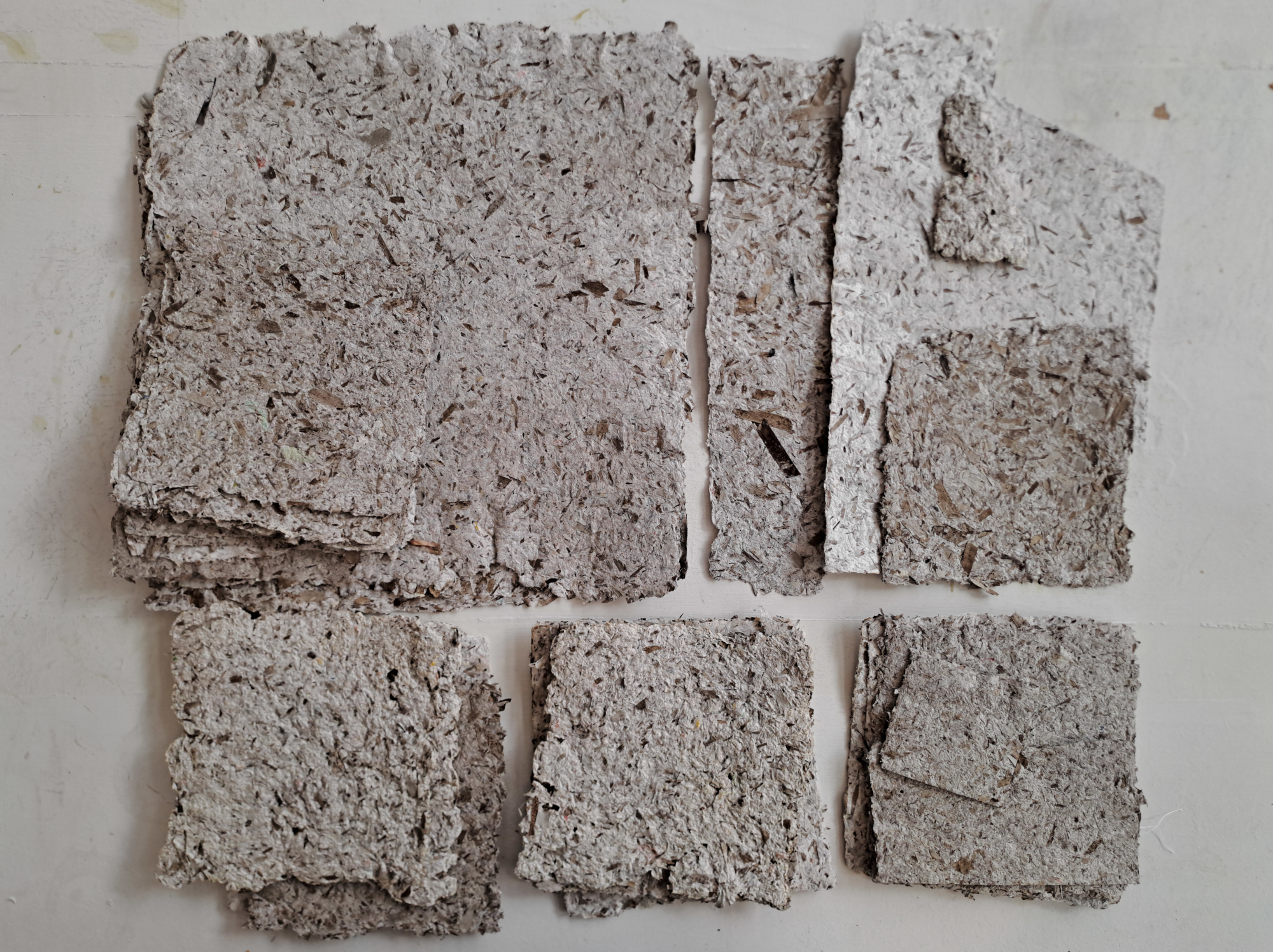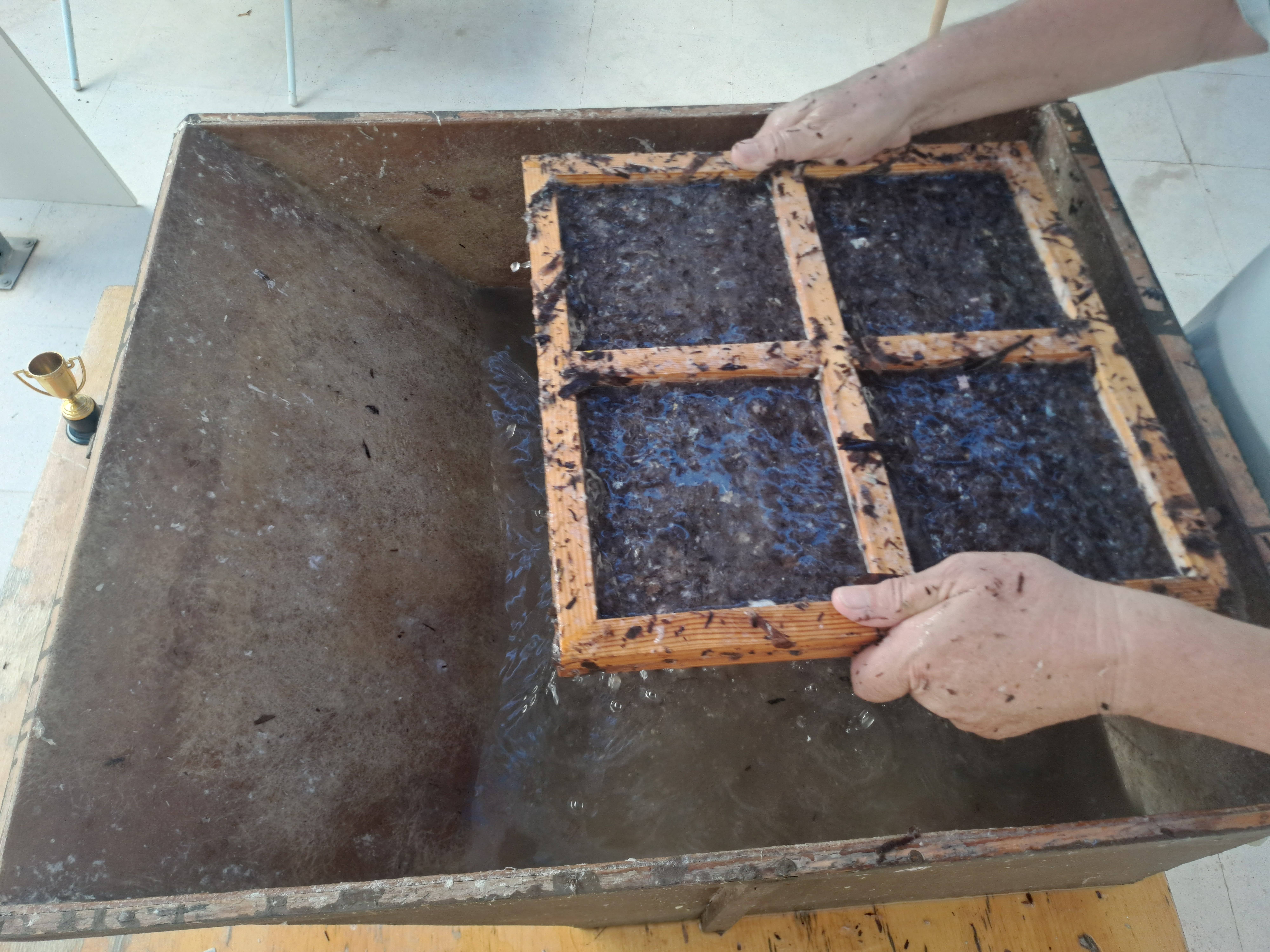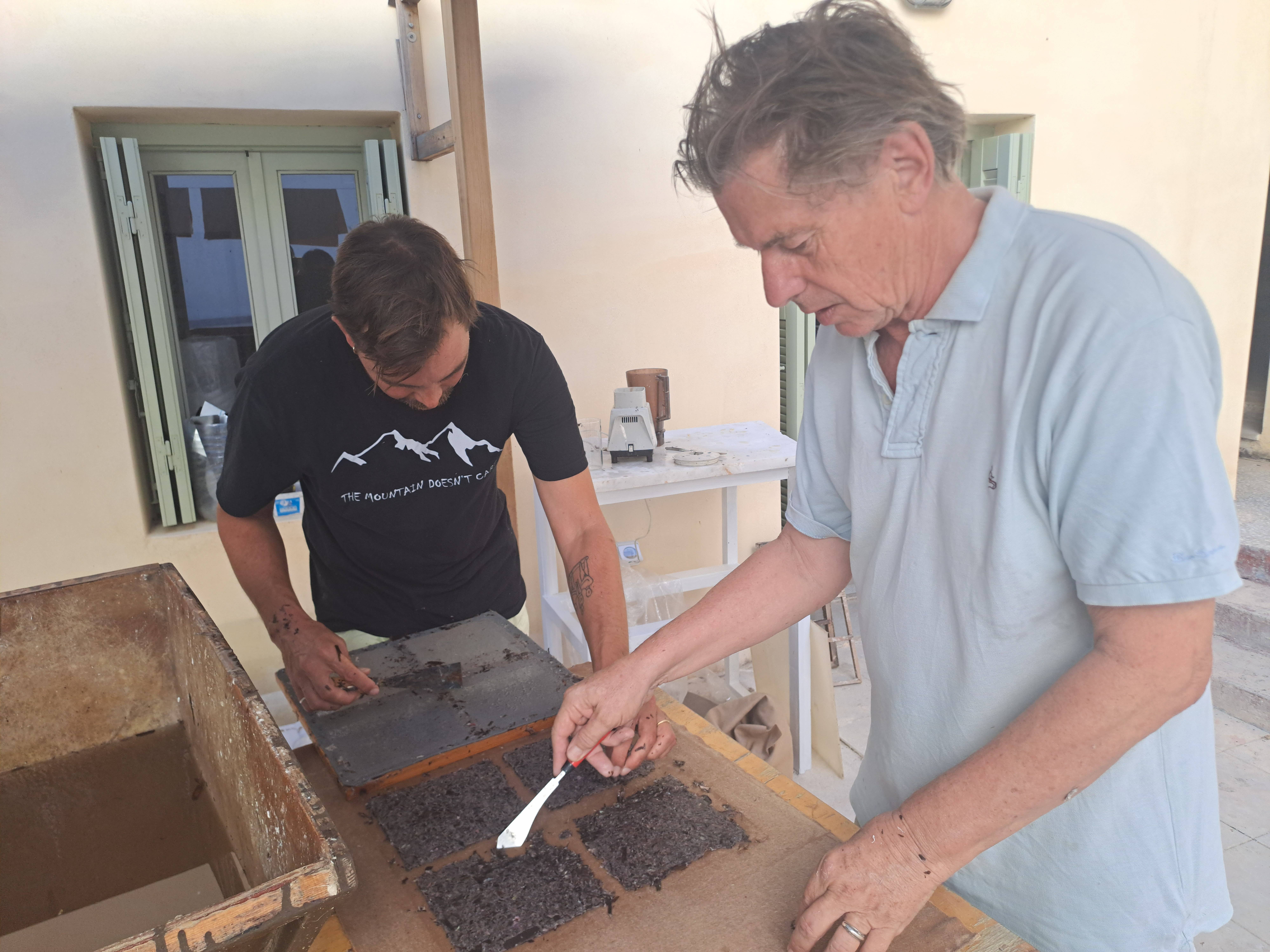 Σε συνεργασία με τον ντόπιο καλλιτέχνη Paul Walker (https://www.paulwalker.gr/), εξερευνήσαμε πώς θα μπορούσε να χρησιμοποιηθούν τα φύκια για τη δημιουργία χειροποίητου χαρτιού. Προστέθηκαν ψιλοκομμένα φύκια σε χαρτοπολτό για να δημιουργηθεί ένα μείγμα που ανακατεύτηκε σε κόλλα (πάστα σιταριού). Δοκιμάσαμε διάφορες αναλογίες φυκιού χαρτιού, για να δούμε ποιο θα ήταν το πιο ανθεκτικό και ποια χρώματα θα έβγαιναν στις αποξηραμένες μορφές.